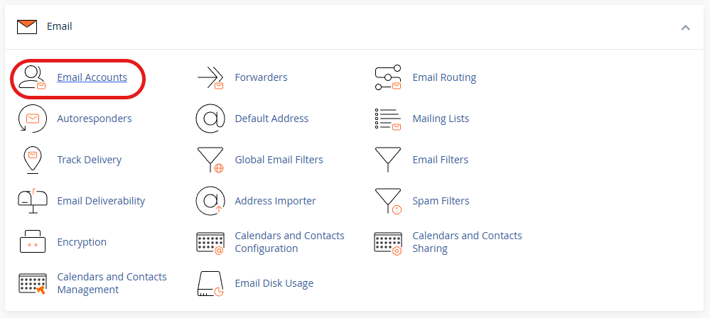 بخش Email، مربوط به ابزار های مختلف در هاست شما میباشد که میتوانید با آنها، اقدامات مختلفی در مدیریت آدرس ایمیل هاست خود انجام دهید. برای ایجاد حساب ایمیل در هاست خود، نیاز است وارد بخش Email Accounts در آن شوید.