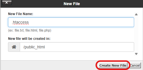 - In the public_html directory (or any folder associated with your domain), create a file named .htaccess.