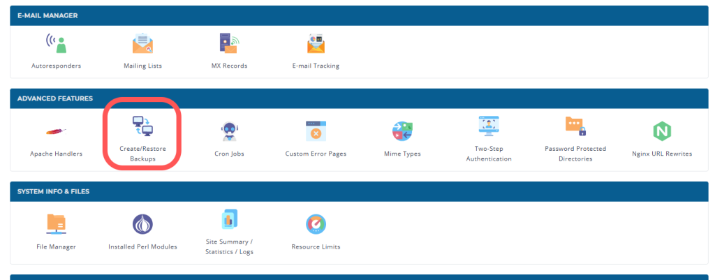 • On the main page of the control panel, in the Advanced Features section, we enter Create/Restore Backups.