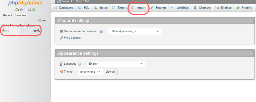• Then, click on the name of your created database and go to the import tab within it.