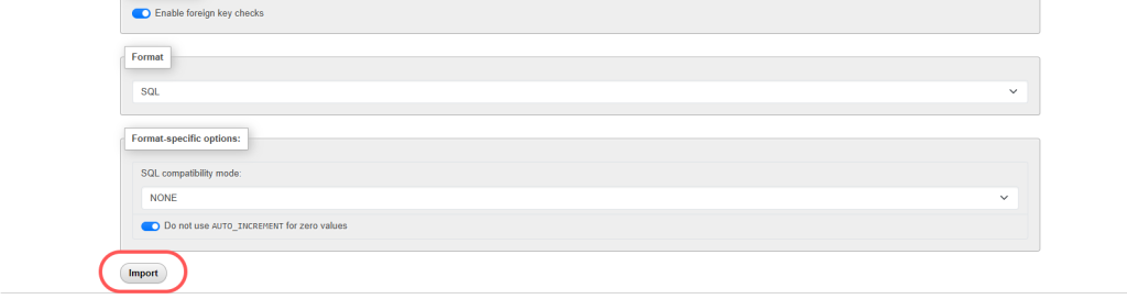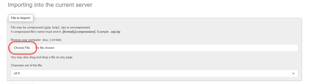 • In the import tab, select Choose File and upload the .sql database file that was in the backup and that you downloaded to your system.
